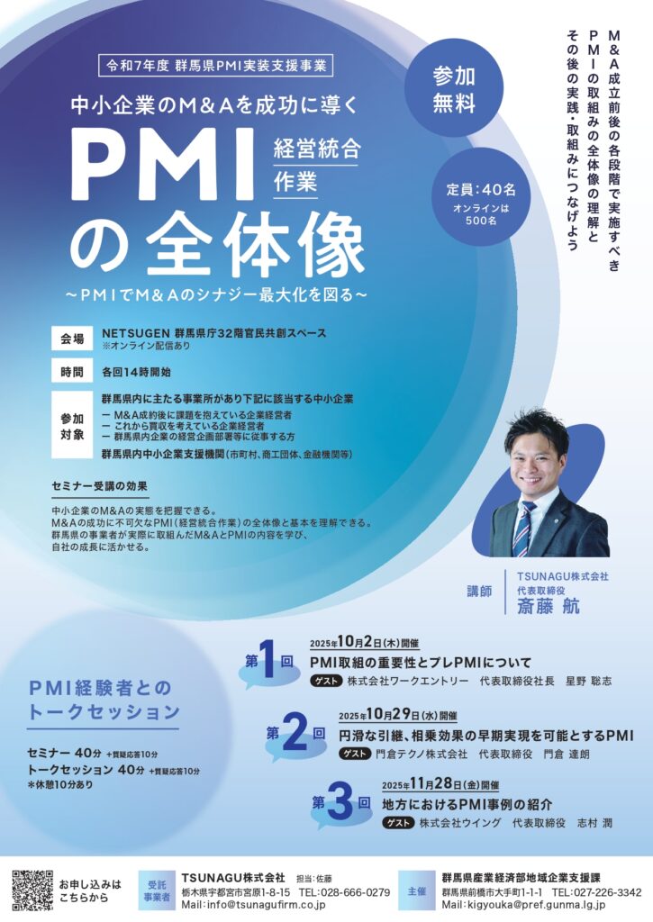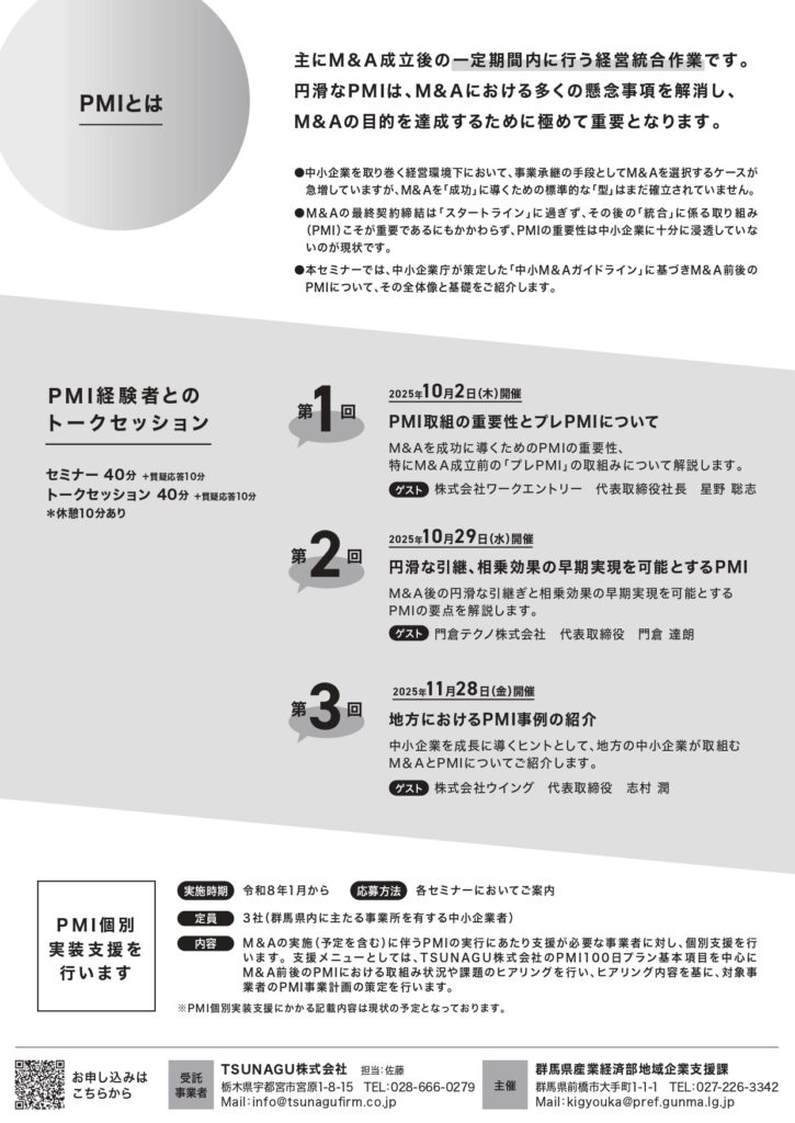 群馬県産業経済部地域企業支援課の主催により、「PMI実装支援セミナー」が開催されます。